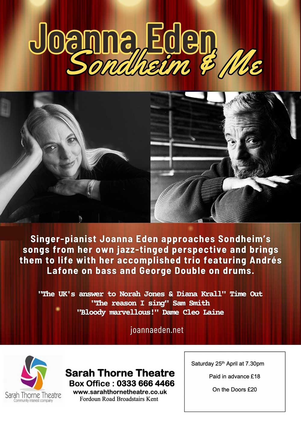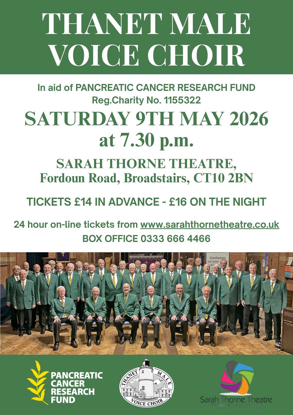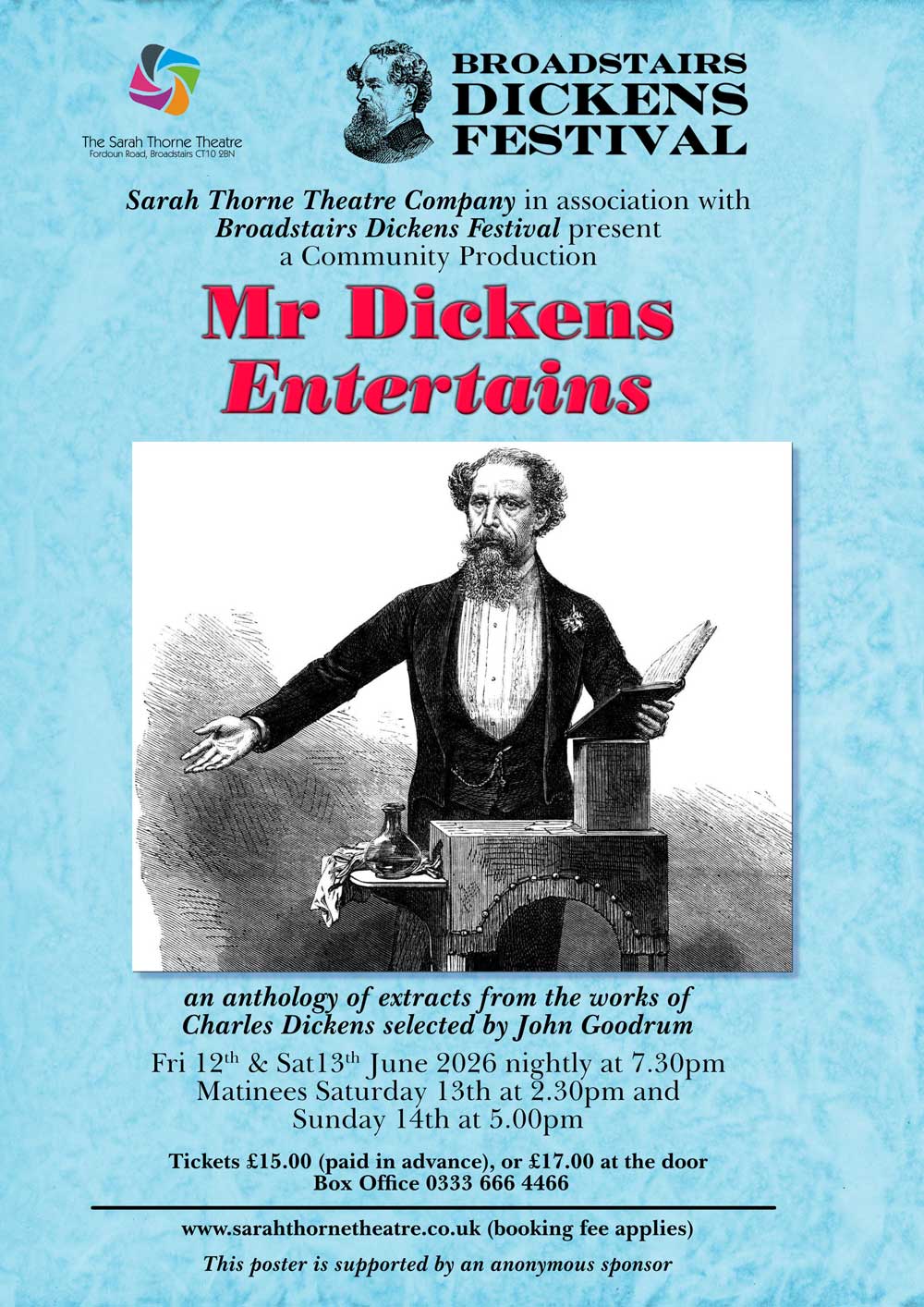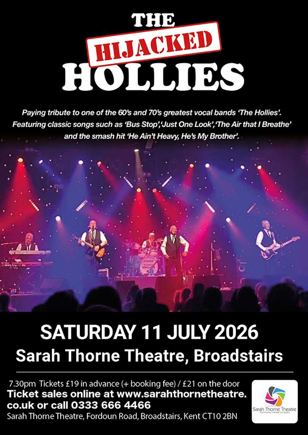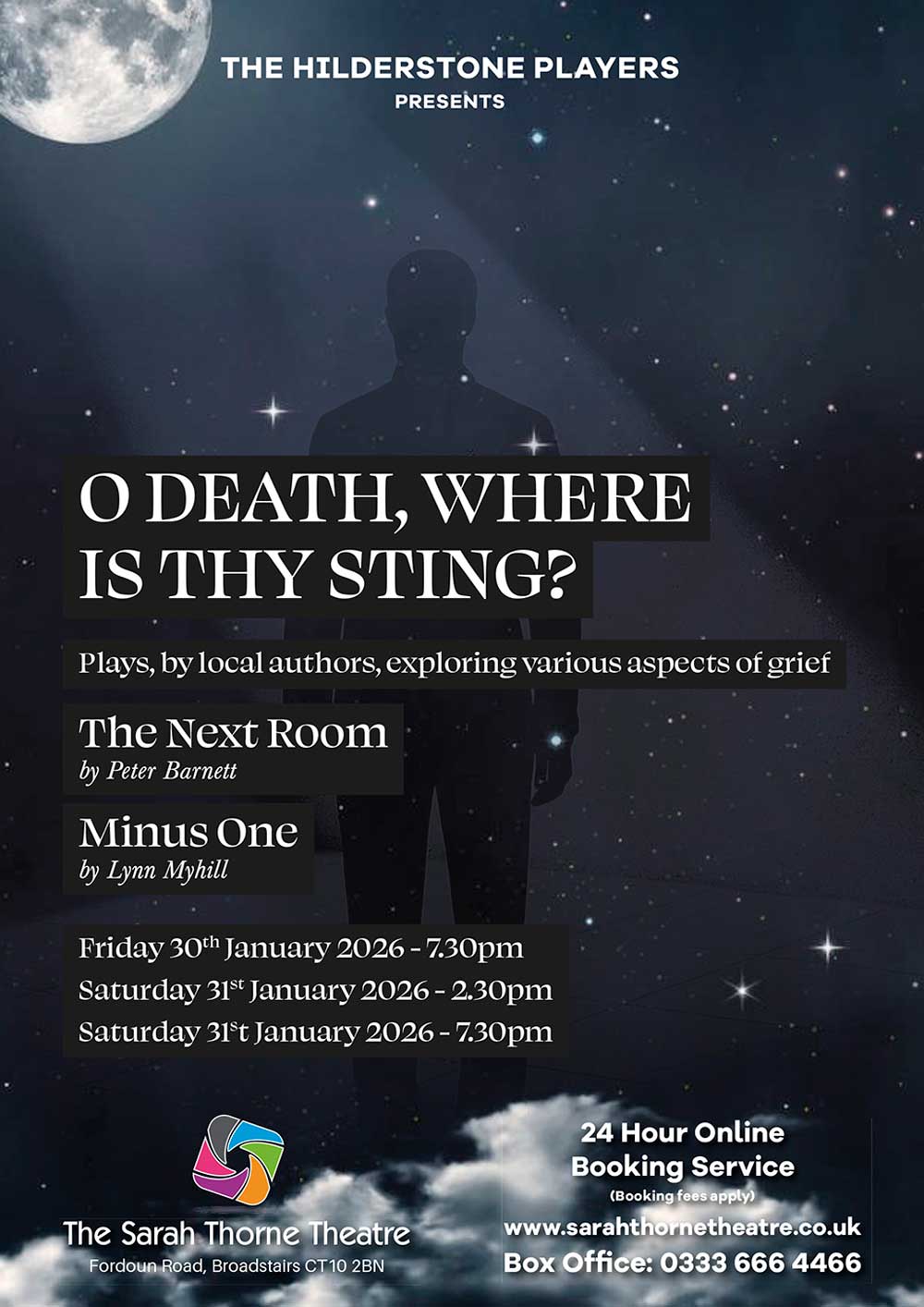 Show Times: Show times vary with each production but rule of thumb allow two hours. For any precise information contact us by e-mail on info@sarahthornetheatre.co.uk or telephone on 01843 863701.